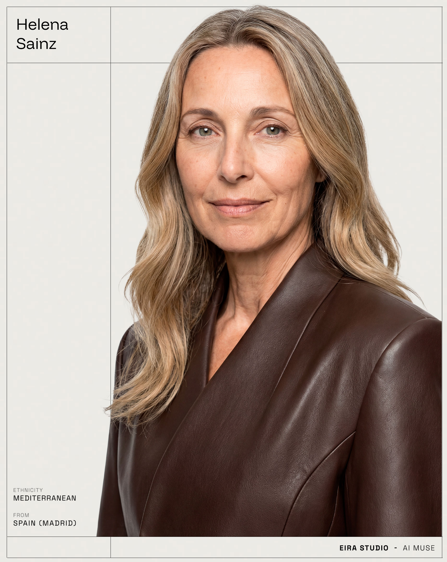 A rebellious spirit from Madrid, Helena celebrates beauty at every stage of life. With her warm gaze and radiant confidence, she transforms effortlessly from sophistication to pure authenticity. Charismatic, versatile, and unapologetically natural, she’s the kind of muse who turns every campaign into an unforgettable story of maturity and style.